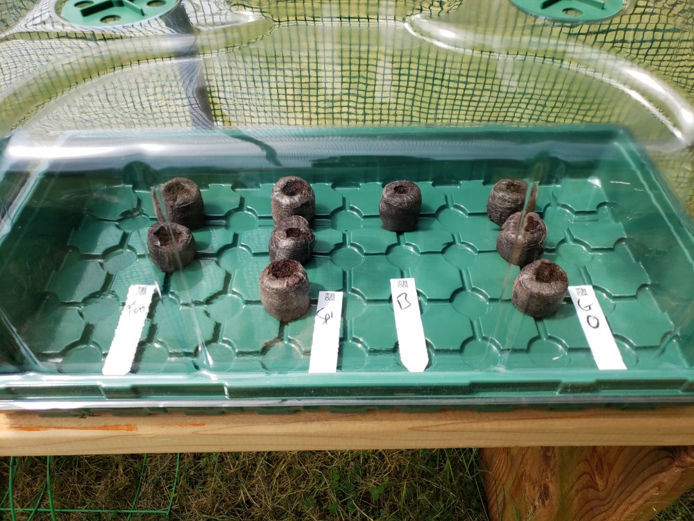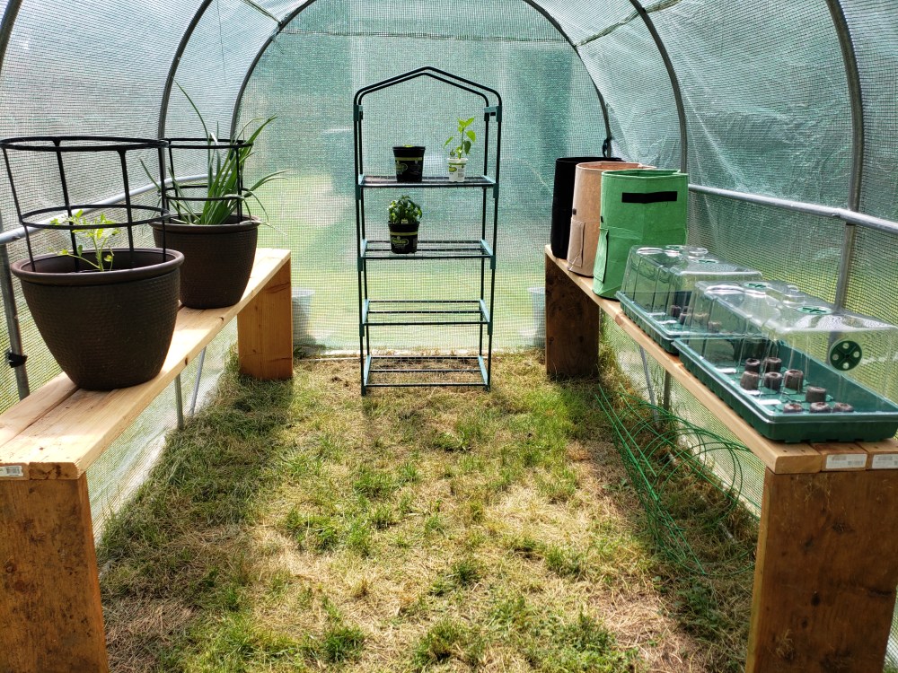 Golden raspberries are beginning to ripen! Also, might need more shelves in the greenhouse. 🙂